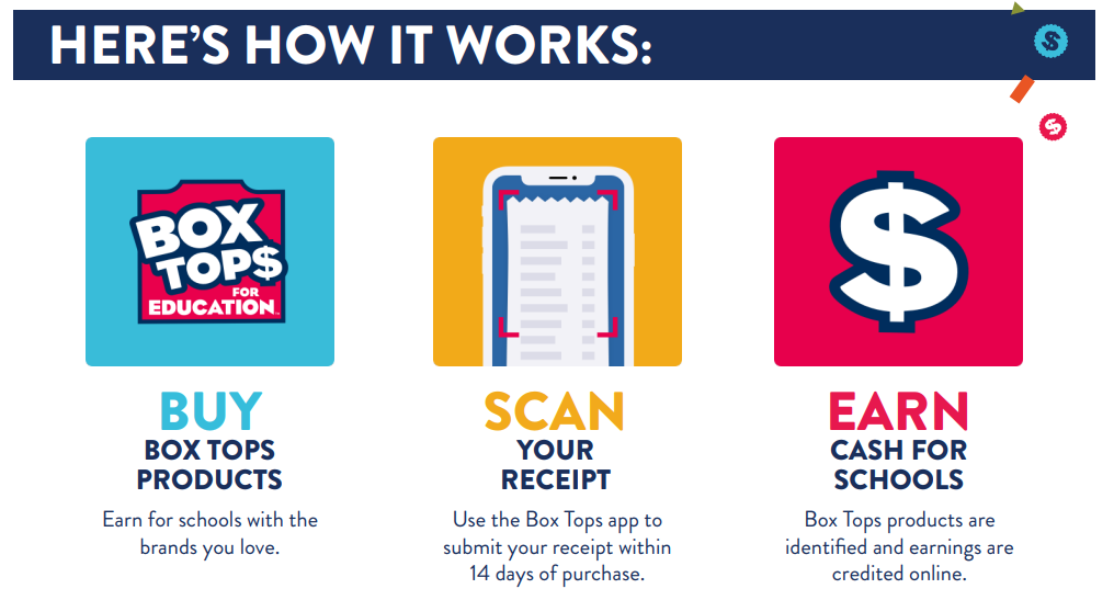 Buy groceries & scan your receipt. The app automatically identifies Box Tops products on your receipt and earnings are credited to our school online. Even if you’re shopping online or doing grocery pickup, you can submit you digital or email receipt with the Box Tops app and earn. Then, twice a year, our school gets a check!